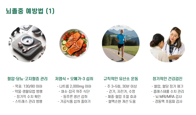 - 예방은 고혈압·당뇨 관리, 저염 식사, 꾸준한 운동, 금연·절주부터 시작
