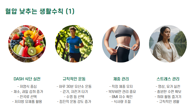 - DASH 식단 실천: 저염식, 채소·과일 위주
