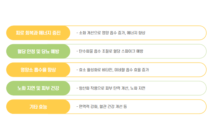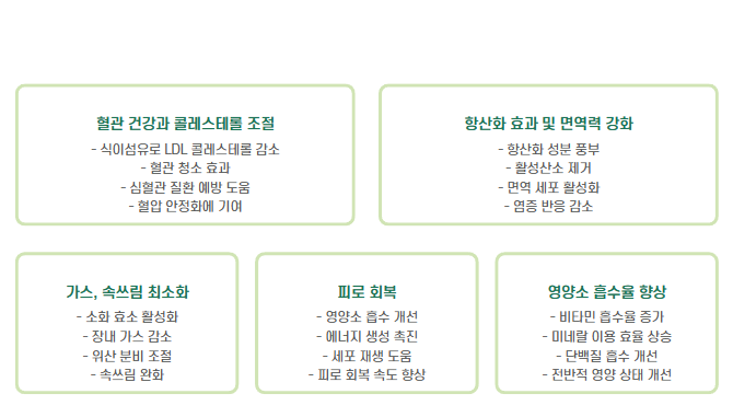 - 식이섬유와 발효 성분이 장 내 유익균 성장에 도움을 주며 장 연동 운동을 촉진해 변비 완화에 효과적입니다.
