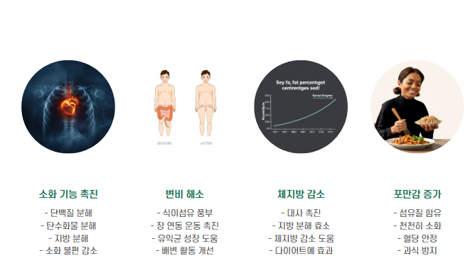 - 소화 효소가 장내 음식 분해를 원활히 도와 가스 발생과 속쓰림 증상을 줄여줍니다.
