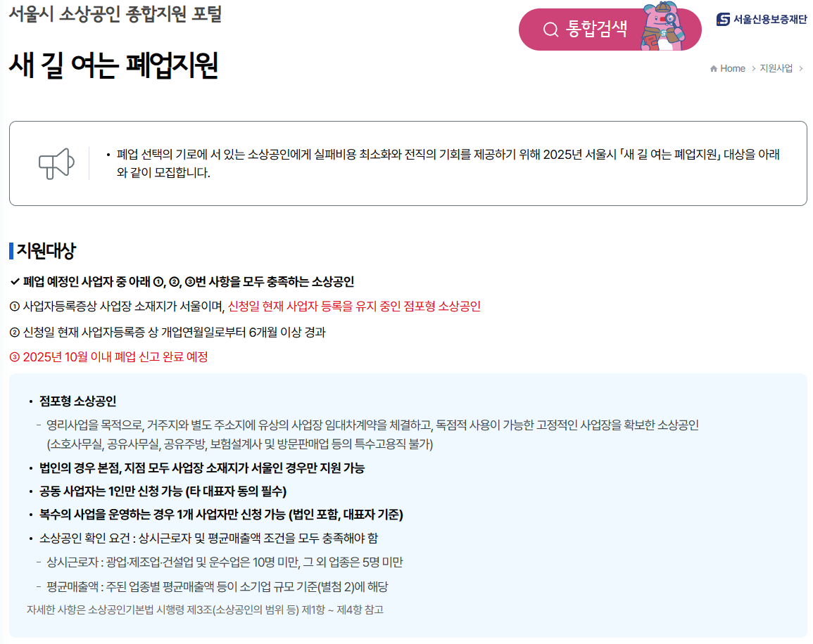 - 대상: 서울시에 소재한 폐업 예정자 또는 폐업한 소상공인