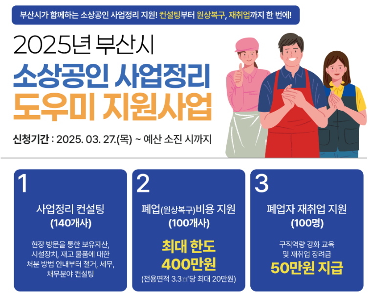 - 대상: 부산 지역 내 폐업 또는 실직으로 어려움을 겪는 소상공인