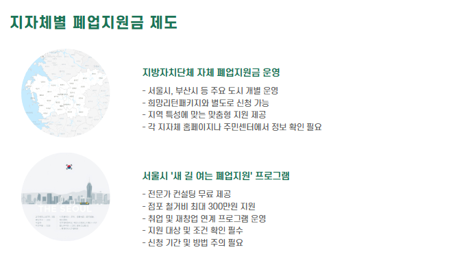 희망리턴패키지 외에도 서울시, 부산시 등 지방자치단체에서도 자체 폐업지원금 제도를 운영하고 있습니다.