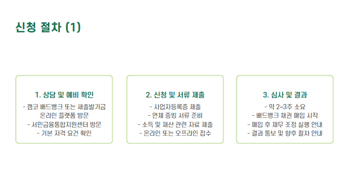 약 2~3주 내 심사, 배드뱅크 채권 매입 시작, 매입 후 채무 조정 실행 사전 안내