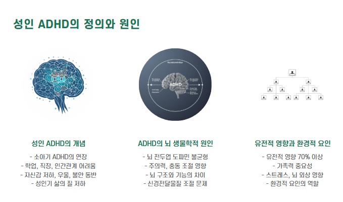성인 ADHD는 소아기에 진단받지 못한 ADHD가 성인기에 이어진 경우가 대부분입니다. 학업이나 직장, 인간관계에서 어려움을 겪게 되며, 자신감 저하나 우울, 불안까지 동반되는 경우가 많습니다. ADHD는 뇌 전두엽의 도파민 불균형으로 발생하며, 유전적 영향(70% 이상)이 가장 크고 스트레스나 뇌 외상 등도 원인이 됩니다.