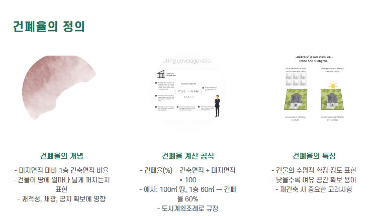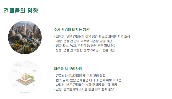 - 특징: 건물이 땅에 얼마나 넓게 퍼지는지를 뜻함 → 쾌적성, 채광, 공지 확보에 영향
