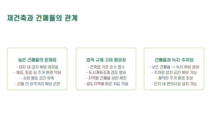 - 건폐율이 높으면 대지 내 공지 확보가 어려워 법적 규제에 걸릴 수 있음