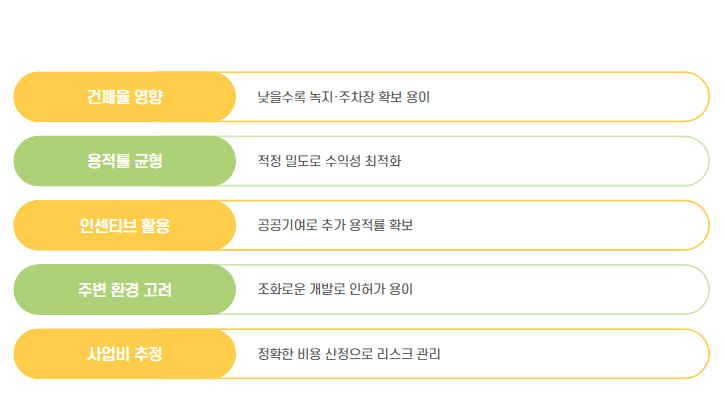| 건폐율 | 낮을수록 녹지·주차장 확보 쉬움 |