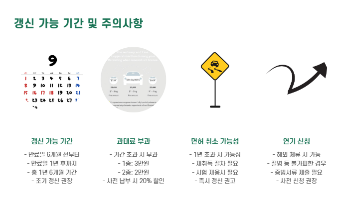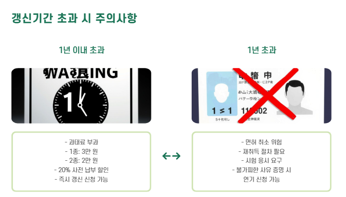 - 갱신기간 초과 시 과태료 부과 및 일정 기간 지나면 면허 취소 가능성 있음