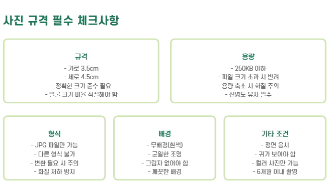| 사진 파일 | JPG, 3.5×4.5cm, 250KB 이하, 최근 6개월 이내 촬영 |