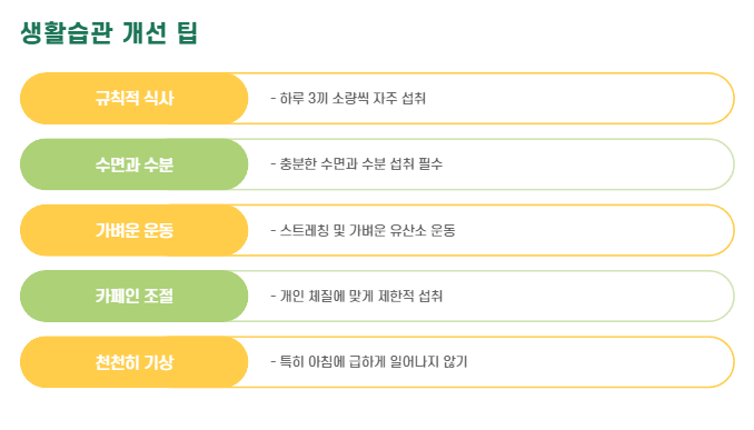 - 카페인 섭취는 개인 체질에 따라 제한적 사용