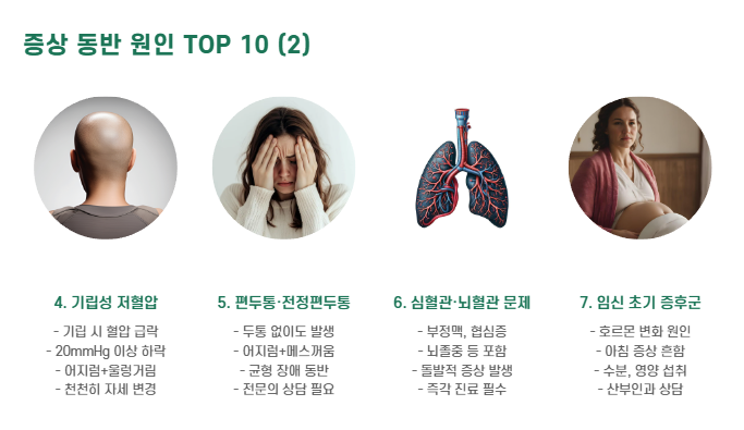 부정맥, 협심증, 뇌졸중 등은 돌발 어지럼, 메스꺼움, 흉통, 감각 마비를 동반할 수 있어 즉각 진료가 필요합니다 .