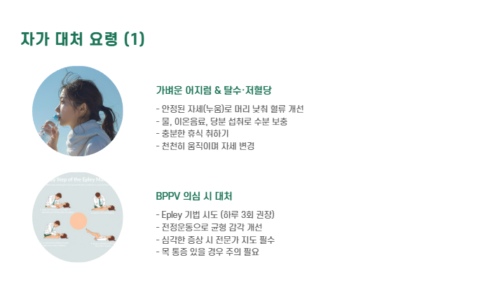 | BPPV 의심 | Epley 기법·전정운동 시도 |