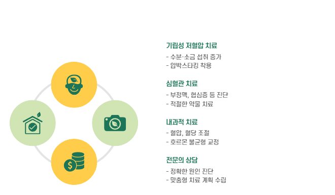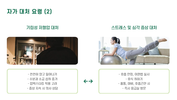 | 기립성 저혈압 | 천천히 앉고 일어나기, 수분과 소금 섭취 |