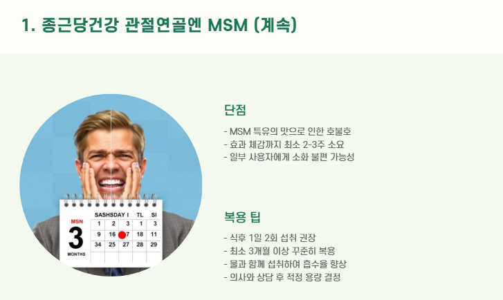 - 중복 성분 체크: MSM, 글루코사민, 콘드로이친 등이 중복되지 않도록 주의