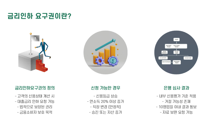 금리인하요구권은 고객이 본인의 신용상태가 개선된 경우, 은행에 대출금리 인하를 요청할 수 있는 권리입니다.