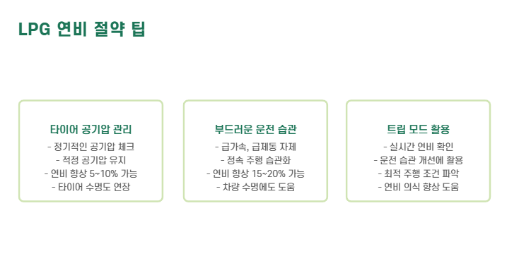 - 급가속·급제동 자제: LPG 차량은 부드러운 운전이 연비 향상에 핵심