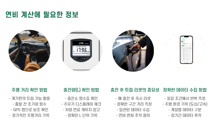 → 충전 후 트립 리셋 → 일정 거리 주행 → 다음 충전 시 리터 수로 나누기