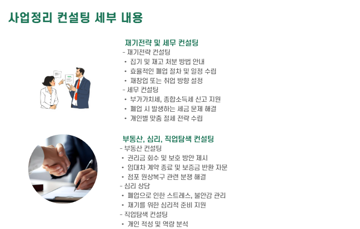 - 재기전략 컨설팅: 집기 처분, 절차 안내 등