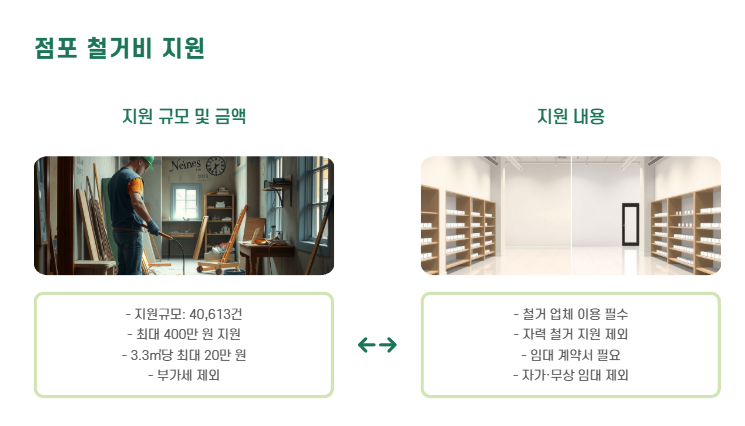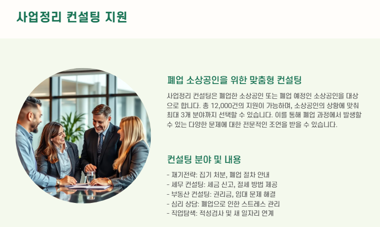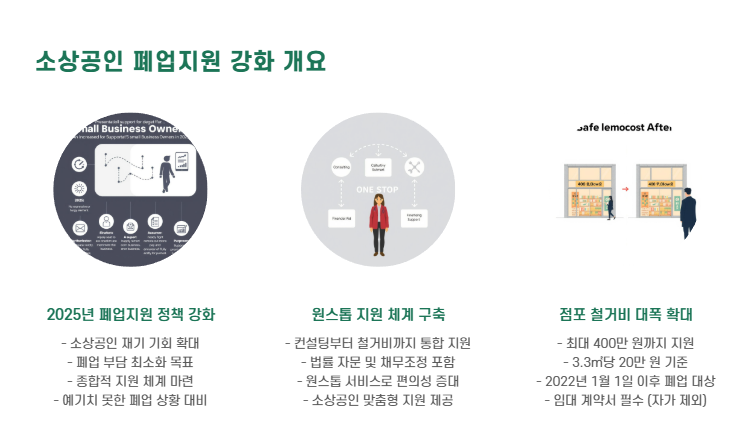 예기치 못한 상황으로 가게를 정리해야 하는 소상공인들을 위해 정부가 컨설팅부터 철거비, 법률, 채무조정까지 원스톱으로 돕는 제도입니다.