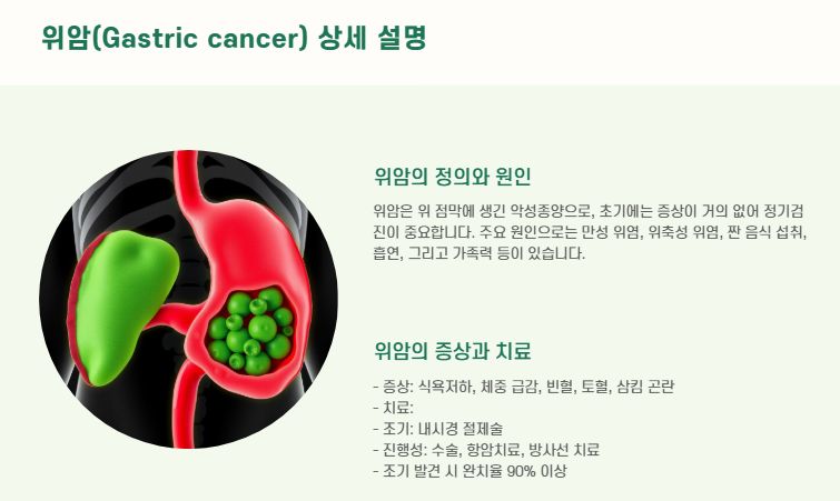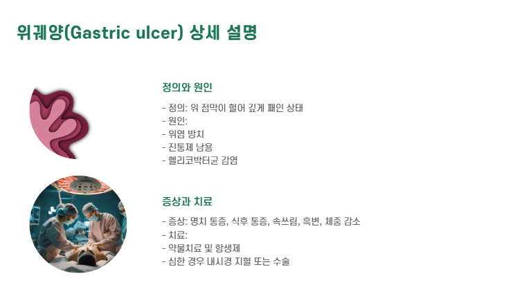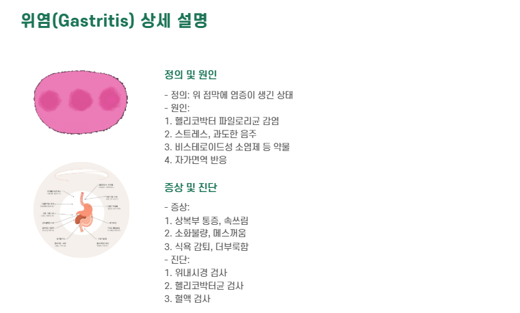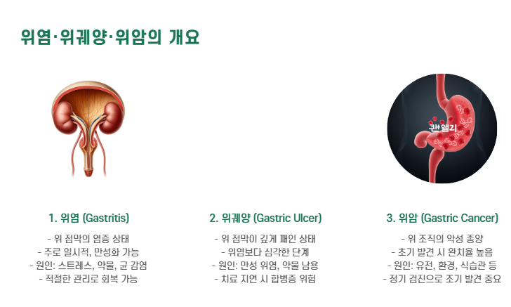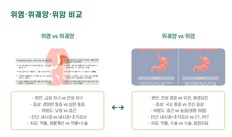 | 정의 | 위 점막에 염증 발생 | 점막이 헐고 패임 | 암세포가 위 조직에 생김 |