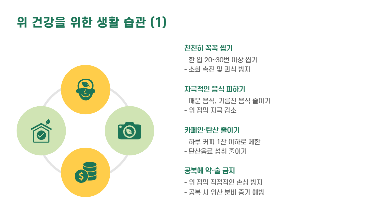 - 따뜻한 물 자주 마시기: 위 자극 줄이고 소화에 도움