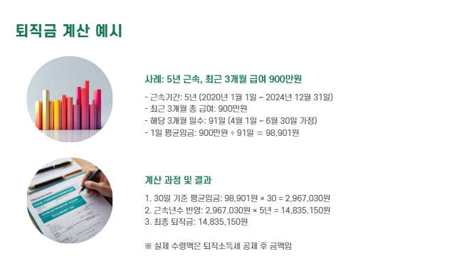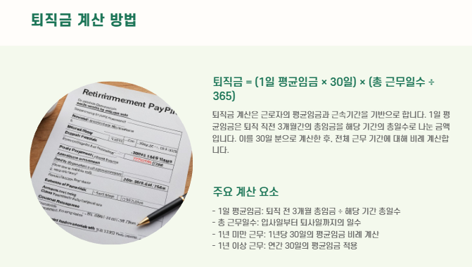 - 1일 평균임금: 퇴직 직전 3개월간의 총임금을 총일수로 나눈 값