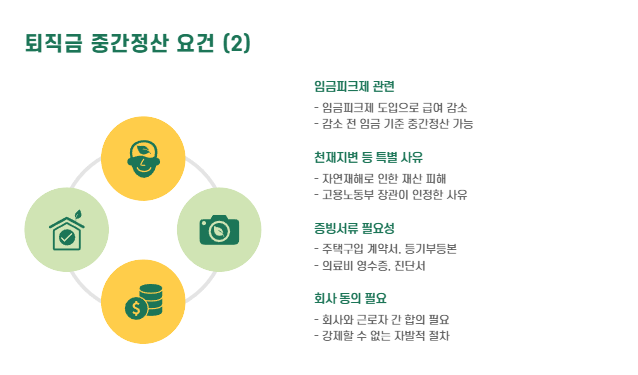 퇴직금은 원칙적으로 퇴직 시 일괄 지급되지만, 아래와 같은 특별한 사유에 해당하는 경우 중간정산이 가능합니다.
