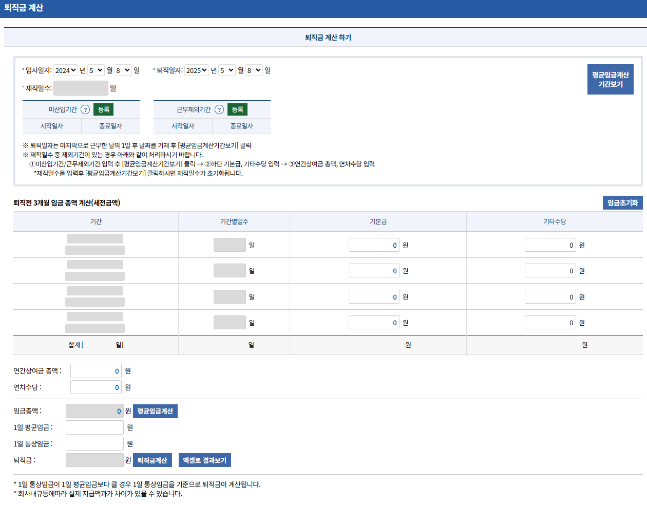 - 입력 항목: 입사일, 퇴사일, 최근 3개월 급여, 상여금 여부 등