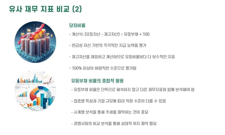 | 당좌비율 | (유동자산 - 재고자산) ÷ 유동부채 × 100 | 현금성 자산 기반의 지급 능력 |