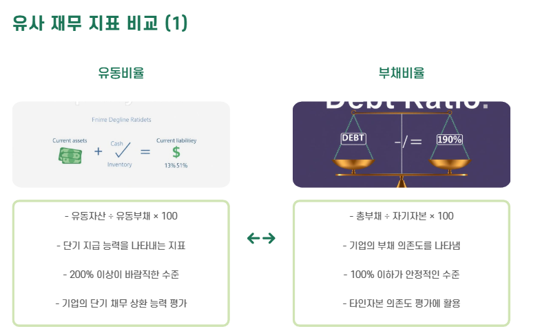 | 유동비율 | 유동자산 ÷ 유동부채 × 100 | 단기 지급 능력 |