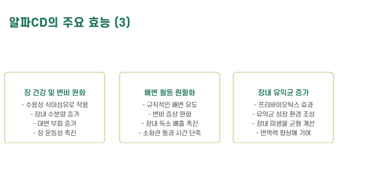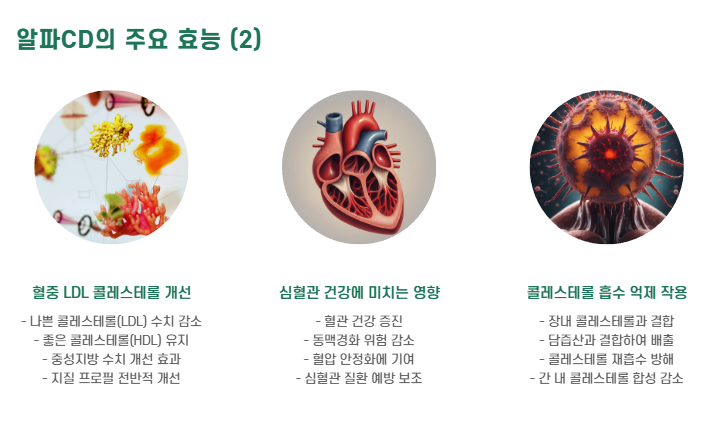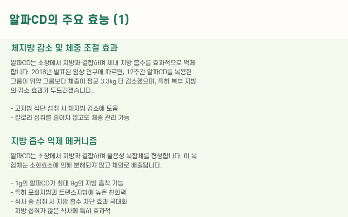 알파CD는 섭취한 지방을 흡수하지 않고 배출하는 특성이 있어, 고지방 식단과 병행 시 체지방 축적 억제에 도움을 줍니다. 다이어트 중인 사람에게 특히 효과적인 보조 성분입니다.
