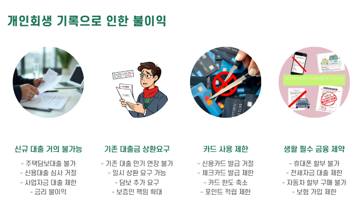 개인회생을 신청하면 일정 기간 동안 신용정보에 '회생절차 진행 중'이라는 공공정보가 등록됩니다. 문제는 이 정보가 최대 5년간 유지되며, 그동안은 다음과 같은 문제가 발생합니다.