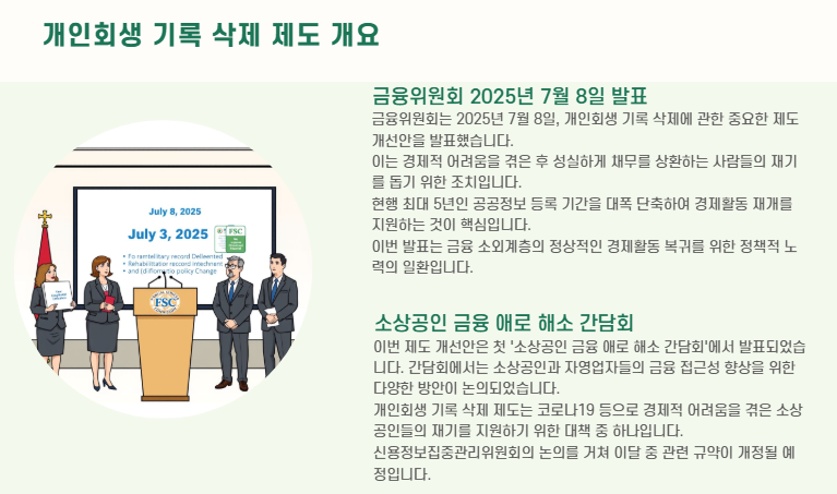 개인회생 기록 삭제 제도는 2025년 하반기부터 시행 예정입니다. 금융위원회는 2025년 8월 중 일반 신용정보 관리규약을 개정하고, 이후 시스템을 정비해 9~11월 사이 본격 시행할 계획입니다.