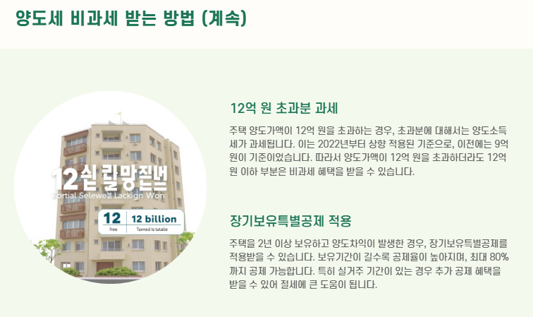 - 양도가액 12억 원 이하 (2022년부터 상향 적용)