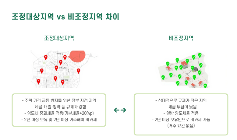- 조정지역 주택은 양도세 중과, 비조정지역은 기본세율(6~45%) 적용