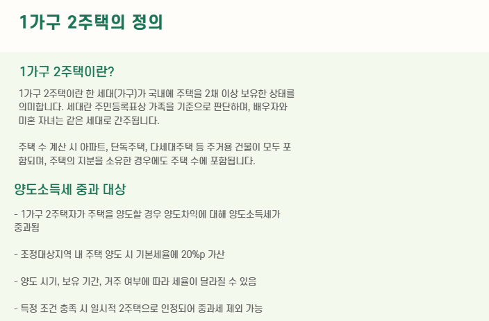 이번 글에서는 1가구 2주택자의 양도소득세가 어떻게 부과되는지, 비과세 조건은 어떤 것들이 있는지, 일시적 2주택 인정 요건은 무엇인지, 그리고 합법적으로 세금을 줄일 수 있는 절세 전략까지 한눈에 정리해드리겠습니다.