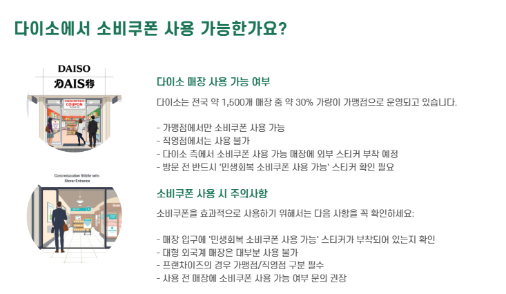 다이소의 경우 전국 약 1,500개 매장 중 약 30% 가량만이 소비쿠폰 사용이 사용이 가능합니다. (직영점인지 가맹점인지에 따라 소비쿠폰 사용 여부가 결정될 것으로 예상)