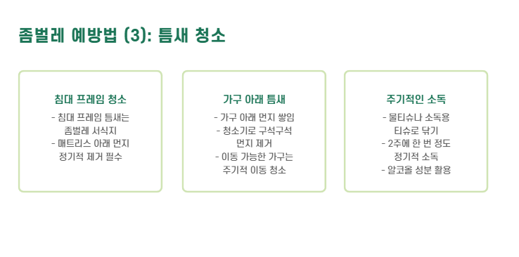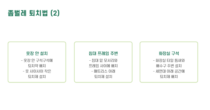 | 퇴치제 설치 | 서식지 집중 타격 | 옷장, 침대 틈새 |