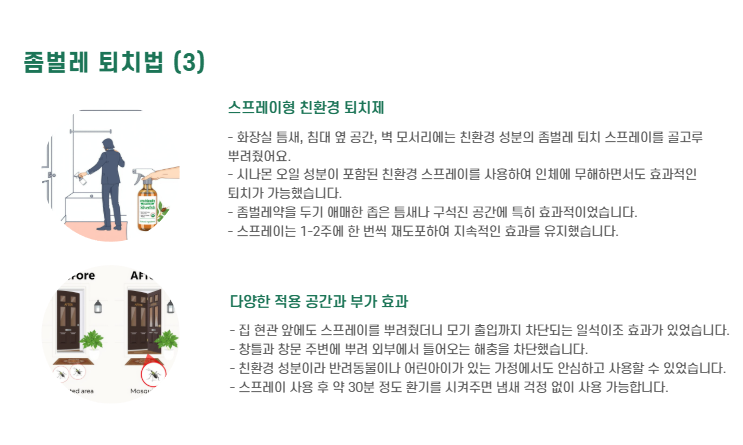 | 스프레이 살포 | 전체적인 퇴치 | 친환경 제품 사용 |