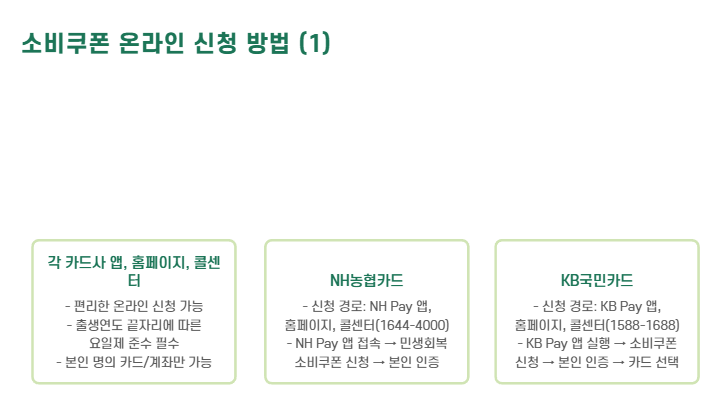 소비쿠폰은 각 카드사 앱, 홈페이지, 콜센터를 통해 쉽게 신청할 수 있습니다.