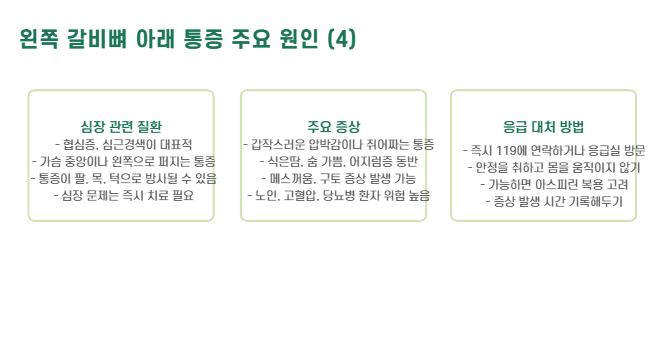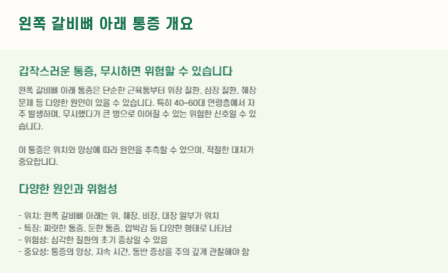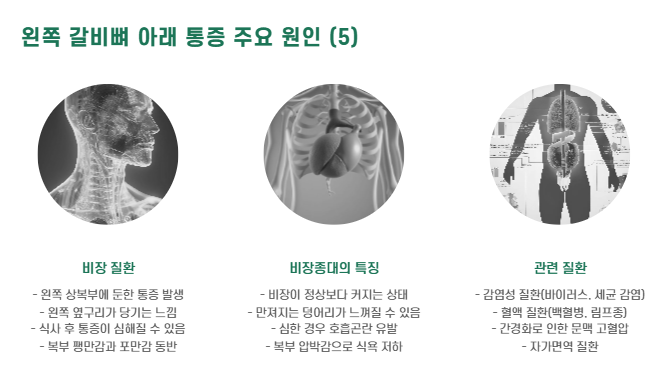 갑작스럽게 왼쪽 갈비뼈 아래 통증이 느껴졌다면 단순한 근육통부터 위장 질환, 심장 질환, 췌장 문제 등 다양한 원인이 있을 수 있습니다. 특히 40~60대 연령층에서 자주 발생하는 통증으로, 무시했다가 큰 병으로 이어질 수 있는 신호일 수도 있죠.