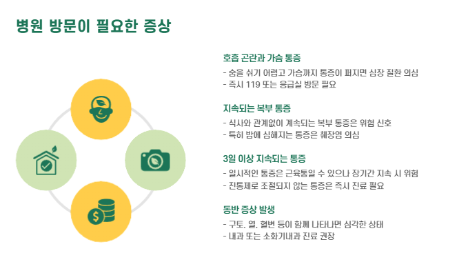 | 심장 질환 의심 | 119 또는 응급실 방문 |