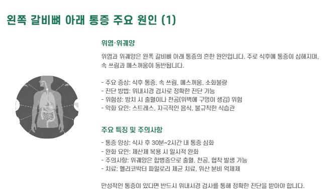 - 특징: 둔한 통증, 왼쪽 옆구리 당김