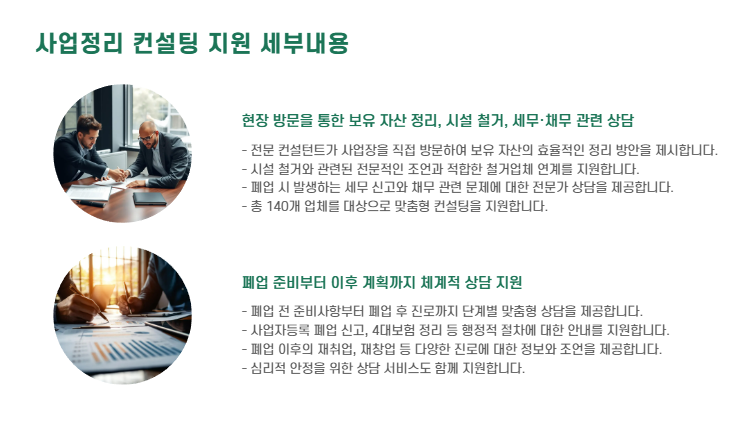 - 현장 방문을 통해 보유 자산 정리, 시설 철거, 세무·채무 관련 상담 등 전반적인 정리 절차를 안내