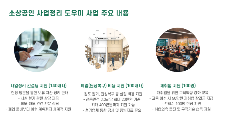 이 사업은 소상공인의 폐업 컨설팅부터 정리비용, 재취업까지 한 번에 지원받을 수 있는 실속형 지원 프로그램입니다.