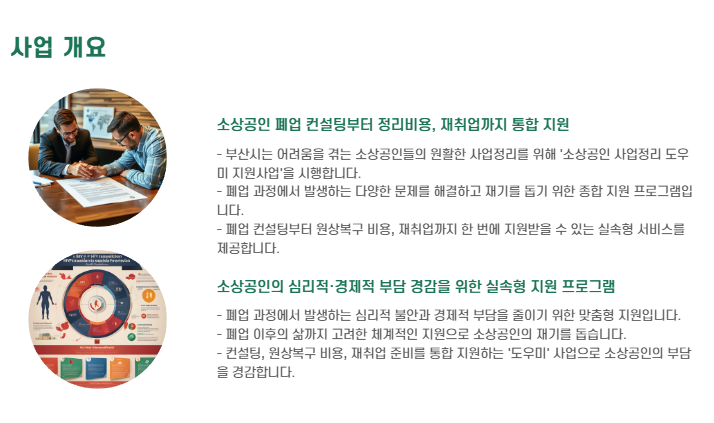 이번 글에서는 부산 소상공인 폐업지원 사업인 '소상공인 사업정리 도우미 지원사업'에 대해 자세히 안내 드리겠습니다.