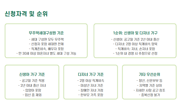| 1순위 | 신생아가구 | 공고일 기준 2년 이내 출산한 자녀가 있는 가구 |