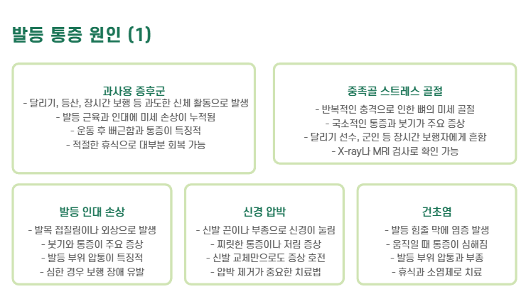 - 초기 대처: 압박 줄이기(신발 끈 느슨하게), 부종 완화, 필요 시 물리치료