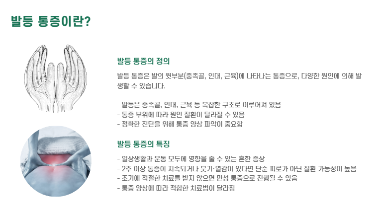 - 특징: 휴식 시 완화되지만 걷기 시작하면 다시 통증 발생, 발등 특정 부위에 국소 통증